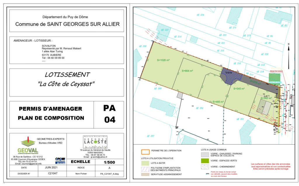 Maître d’oeuvre depuis 2005, Sovalfon vous propose sur la commune de St Georges / Allier, un terrain plat de 485m2 viabilisé, avec jolie exposition et au calme.