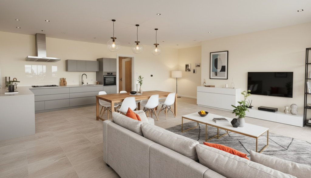 – Une entrée ouvrant sur une pièce de vie de 42 m2 avec cuisine ouverte
